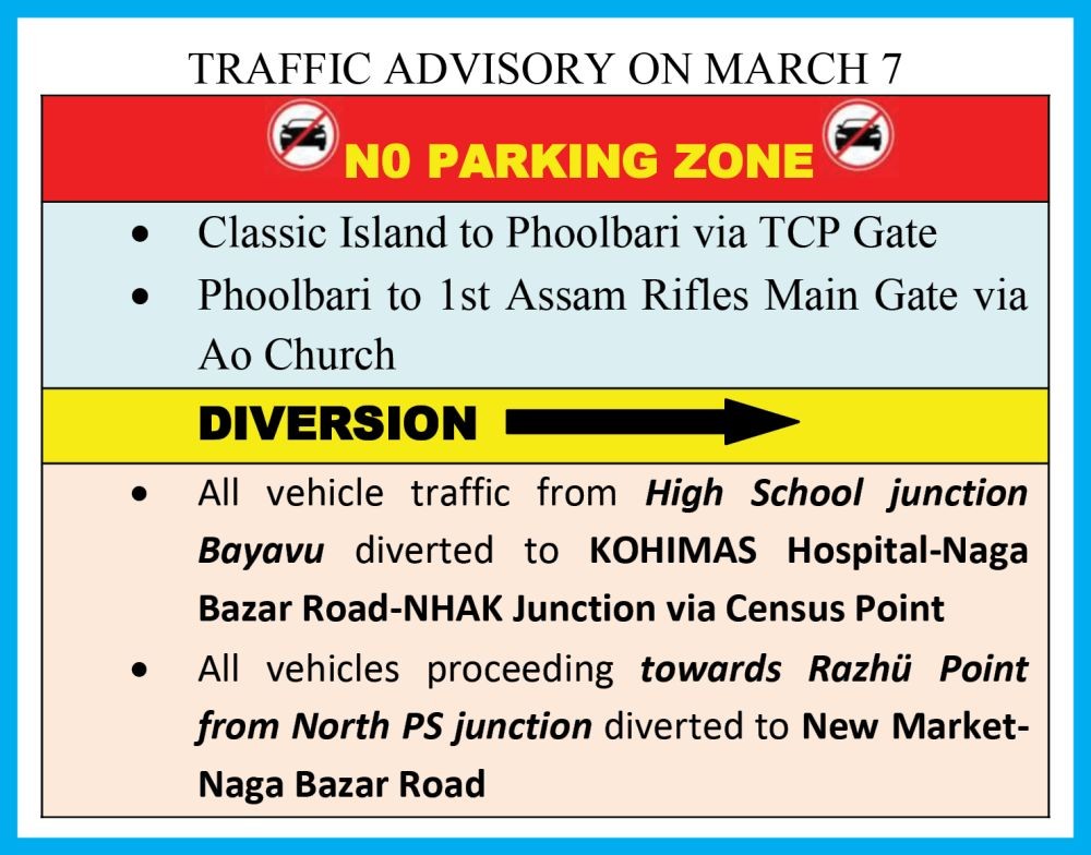The PRO Kohima Police informed on Sunday that several areas in the State capital have been declared “No Parking Zones” in view of the event on March 7.