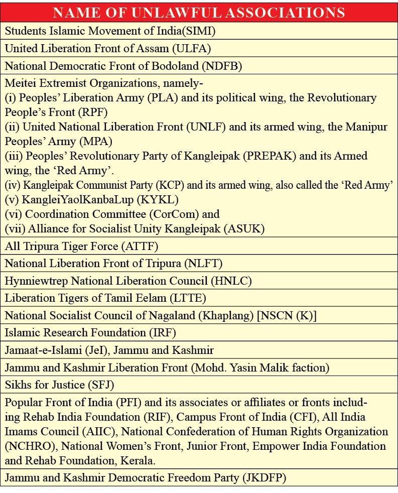 In a written reply, the Union Minister of State in the Ministry of Home Affairs, Nityanand Rai, stated that the Union Government can declare any organisation as an unlawful association under the powers conferred by sub-section (1) of section 3 of the Unlawful Activities (Prevention) Act, 1967 (37 of 1967).