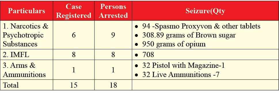 There were also 8 cases involving IMFL, resulting in 8 arrests and the seizure of 708 alcohol-related items. Additionally, one person was arrested in possession of a pistol with a magazine and 32 live ammunitions.