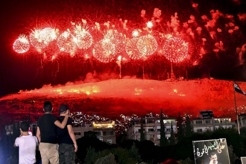 Fireworks illuminate the sky over Qasioun Mountain as supporters of Syrian President Bashar al-Assad gather at Umayyin Square to celebrate his relection following the announcement of the Syrian presidential election results. (Photo: SANA/dpa/IANS)