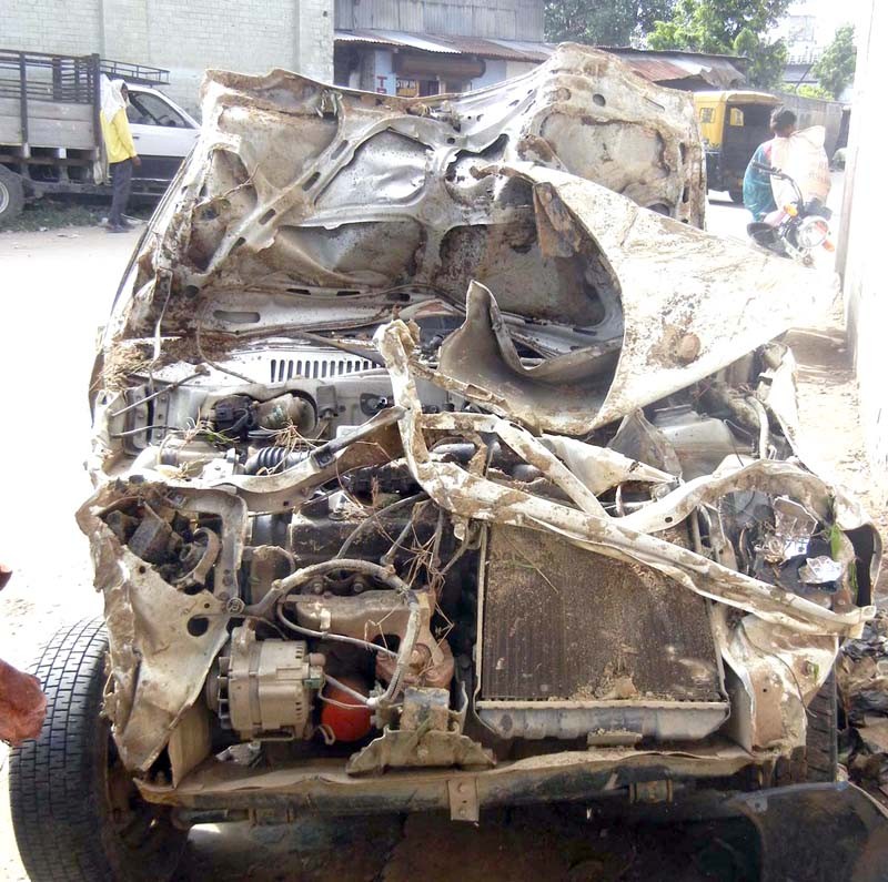 The mangled remains of the ill-fated car after it was pulled out from the Chathe River.