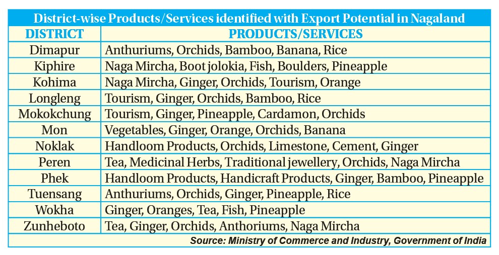 A total of 20 products and services from 12 districts in Nagaland have been identified as export potential, according to an official statement from the Ministry of Commerce and Industry, Government of India.