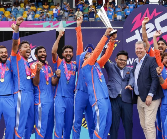 Barbados: Players of team India pose with the tropy after India won the ICC Men's T20 Cricket World Cup Final match against South Africa at Kensington Oval in Barbados on Saturday, June 29, 2024. (Photo: IANS/@surya_14kumar)