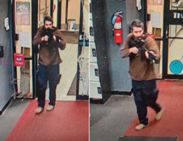 Meanwhile, the Androscoggin County Sheriff's Office released two images of a suspect, showing a bearded man in a brown sweater carrying a firearm walking into a building.