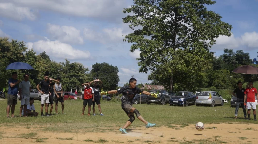 Players in action during the penalty shootout at the 2nd edition of Aphuyemi Youth Gathering cum Penalty Shootout, which was held at Ikishe village ground, Chümoukedima on October 2. (Morung Photo)