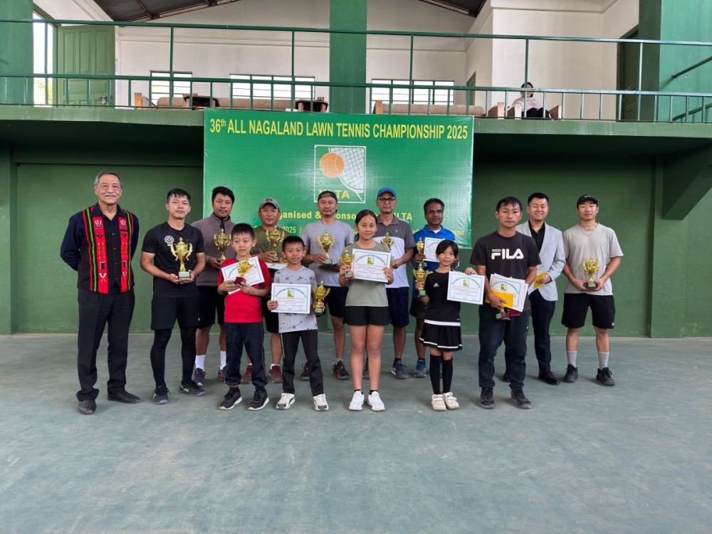 Winners of the 36th All Nagaland Lawn Tennis Championships 2025 pose for a photo in Dimapur on December 13.