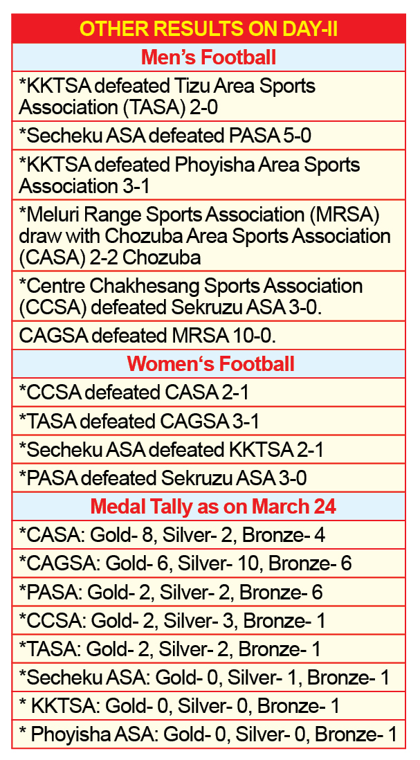 The second day of the 36th Phek District Sports Association (PDSA) Meet on March 24 in Thenyizu village saw Chozuba Area Sports Association (CASA) emerging as a top contender with a tally of 8 gold medals, 2 silver and 4 bronze.