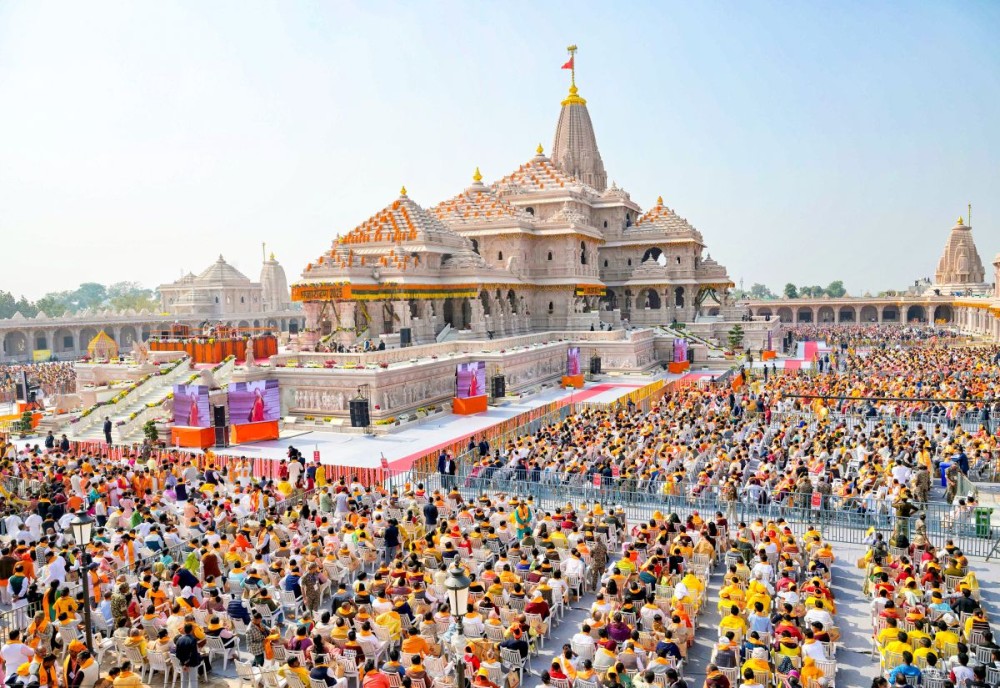 Ayodhya: Gathering during the Dhwajarohan ceremony to ceremonially hoists the saffron flag on the Shikhar of the sacred Shri Ram Janmabhoomi Temple, symbolising the completion of the temple’s construction, in Ayodhya, Tuesday, November 25, 2025. (Photo: IANS/PMO)