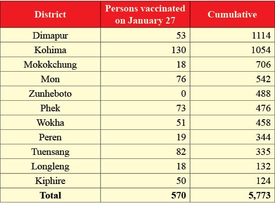 Kohima, January 27 (MExN): The COVID-19 vaccination drive in Nagaland has covered 5,773 health care workers till date, according to an update from State Immunization Officer, Dr Ritu Thurr.
