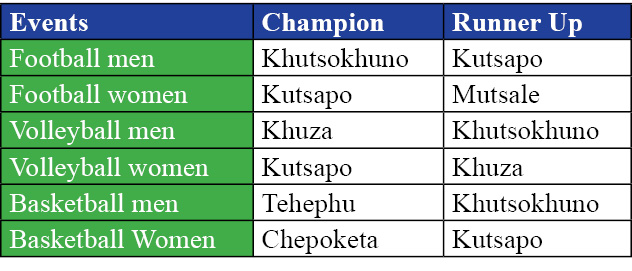 In men’s football, defending champ Khutsokhuno Sports Association emerged as the champion after defeating Kutsapo Sports Association and walked away with Rs 3 lakh including trophy while the runners up received a cash prize of Rs 1.5 lakh. The best discipline award was bagged by Mutsale Sports Association.
