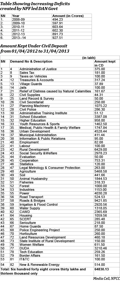 The NPCC Media Cell has in a statement pointed to the borrowing from open market and financial institutions well above the permissible limits; spending huge capital to service the debts and high interest rates and what it alleged was “hoarding a staggering amount of over 648 crores in Civil Deposit which has attracted the attention of the Planning Commission of India (PCI) leading to delay in finalization of the annual plan outlay for 2013-14”.