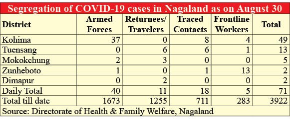 71 new COVID-19 positive cases were reported in Nagaland on August 30, taking the State’s tally to 3922. According to the daily status update from the Directorate of Health and Family Welfare, 49 out of the total cases on Sunday were from Kohima while Tuensang registered 13 cases, Mokokchung 5 and 2 each in Zunheboto and Dimapur. Armed forces made up 40 of the 71 cases while 15 were traced contacts, 11 were returnees and 5 were frontline workers.