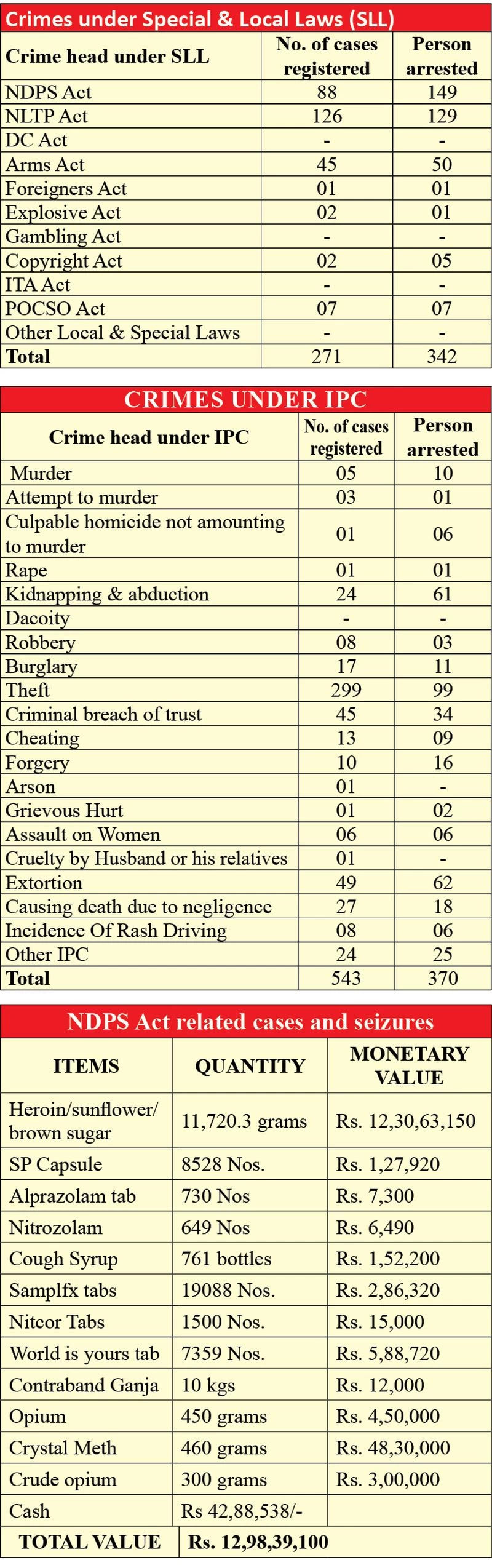 The statistics also revealed that under the Narcotic Drugs and Psychotropic Substances (NDPS) Act, 88 cases were registered leading to the arrest of 149 persons, and a seizure of contraband and cash worth Rs 12,98,39,100.