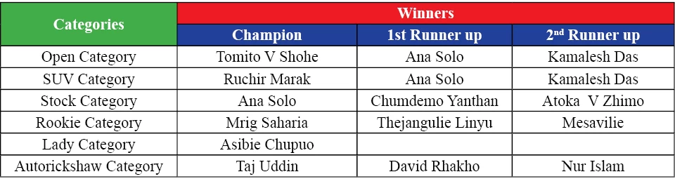 The rally featured Autocross and Autorickshaw rally. Autocross featured the categories of SUV, Open, Stock and Rookie. Stock category and Auto rickshaw rally was held for the first time in Nagaland.