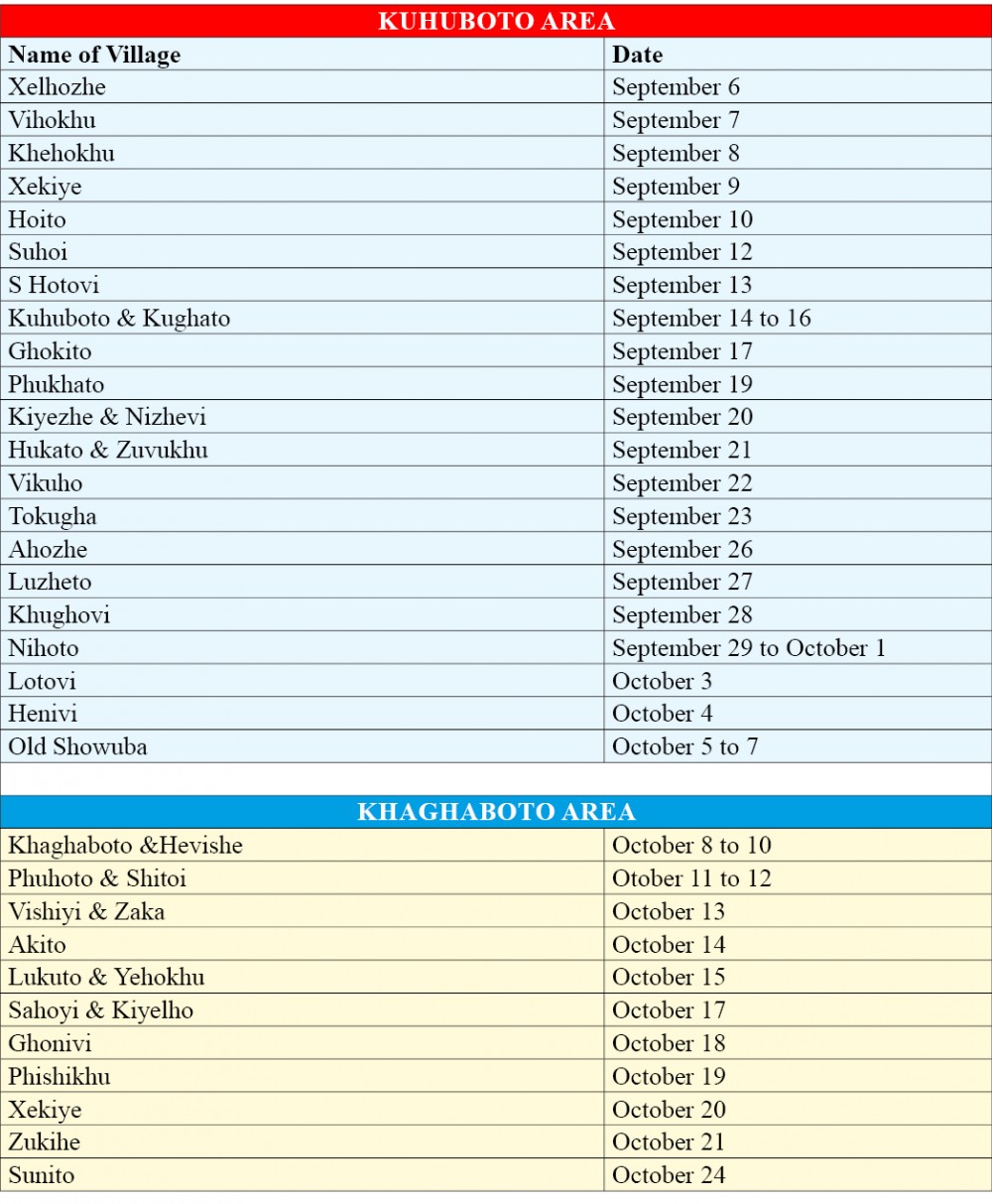 Niuland, September 4 (MExN): An Aadhar enrolment, updation, correction drive under Niuland district will be held from September 6 to November 10, in pursuance to a notification issued by the Nagaland Commissioner on August 9. Informing this in a circular issued through the DIPR on Sunday, Niuland Deputy Commissioner Sara S Jamir has requested all concerned to take note of the schedule. (See Table)