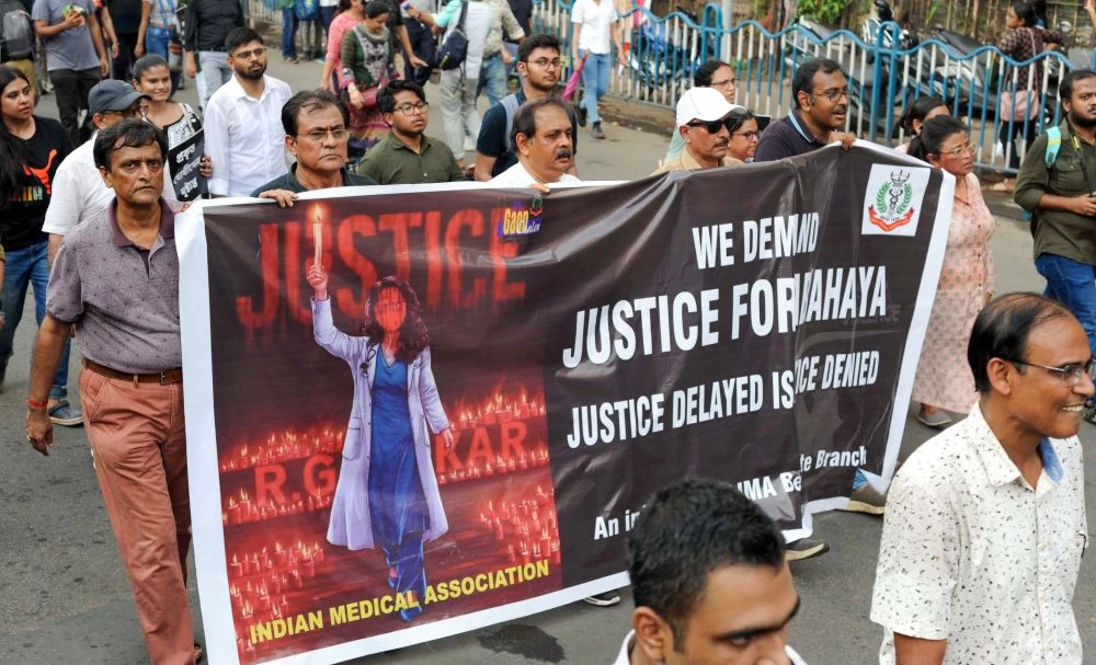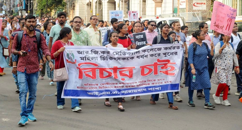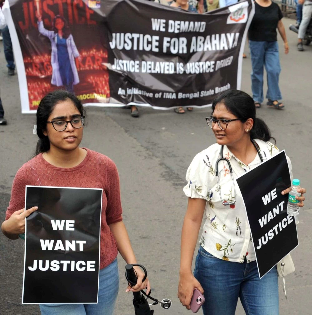 Kolkata: Indian Medical Association (IMA) members and the medical fraternity participate in a protest march , condemning the recent incident at RG Kar Medical College in Kolkata on Saturday, August 17, 2024.(IANS/Kuntal Chakrabarty)