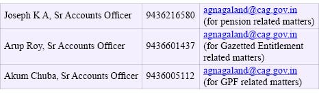 Aggrieved pensioners or government officials facing genuine problems with regard to settlement of any entitlement benefits have been requested to write directly to Uttam Chanda, Deputy Accountant General (A&E) via e-mail at chanda.u@cag.gov.in or agaenagaland@cag.gov.in or through a hand written letter. They may also contact the Grievance Redressal and Feedback Committee, the office informed. All Heads of Departments have also been requested to provide mobile numbers of retirees in their Pension application form and GPF final Payment application form for receiving SMS service regarding status of their Pension and GPF final payment.