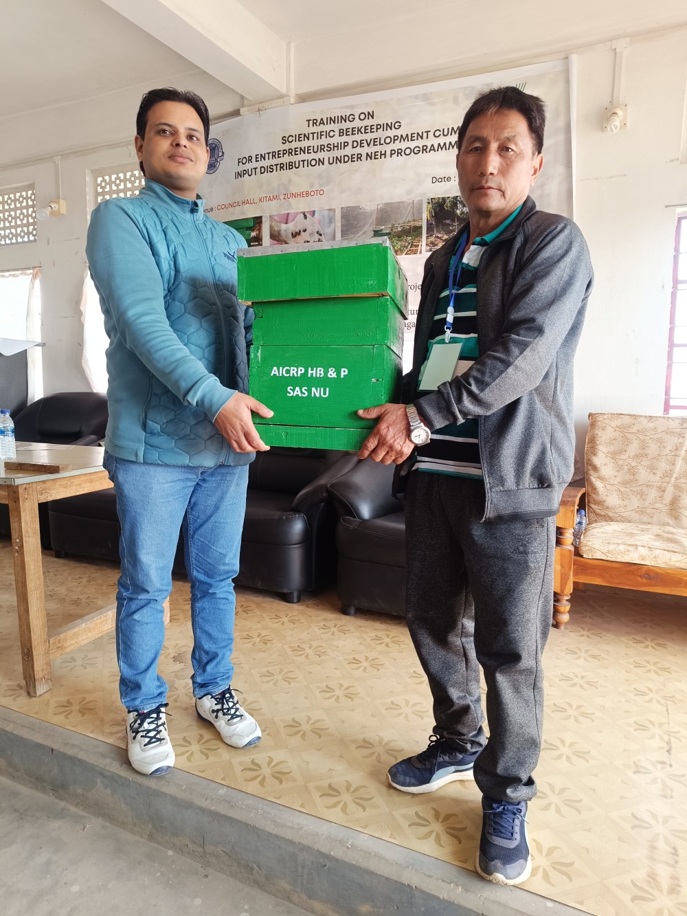 A trainee receives free scientific bee box from Dr. Avinash Chauhan, PI, AICRP(HB&P), SAS, NU, Medziphema during the training on Scientific Beekeeping in Kitami Village on February 10.