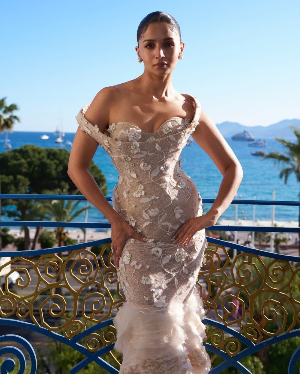 Another picture showed Alia posing elegantly on a balcony with a breath-taking seaside view in the background. She is wearing a form-fitting, off-shoulder gown in champagne hue. The dress has intricate floral embroidery on the bodice and a dramatic, ruffled mermaid-style hem that cascades to the floor.