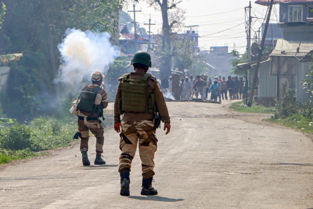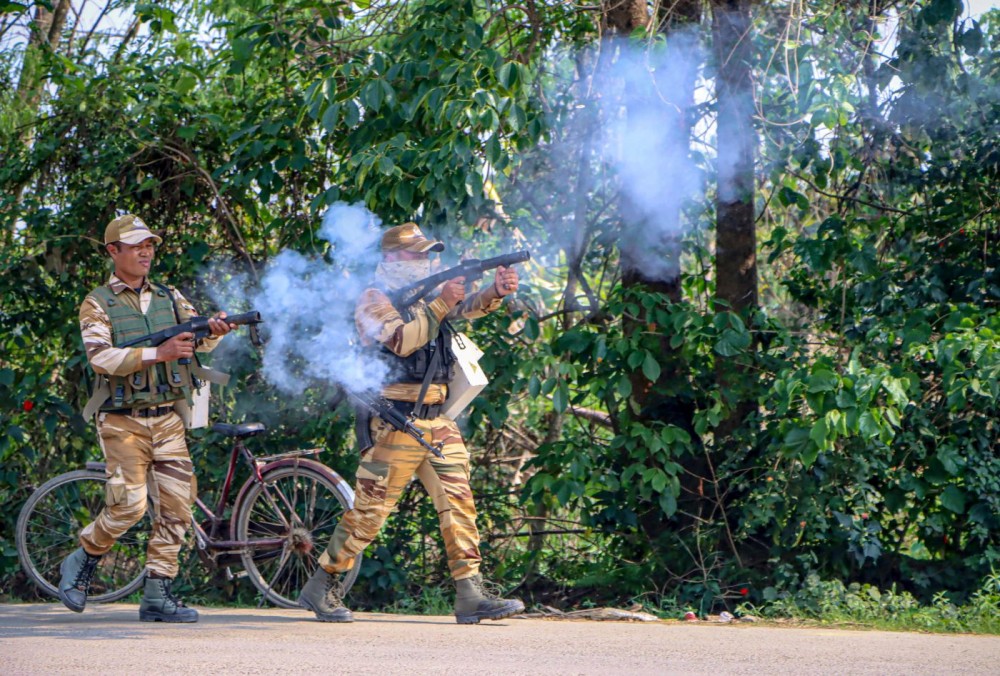 Thoubal: Security forces fire tear gas to disperse protesters attempting to storm the Block Development Office at Wangjing Tekcham Leikai in Thoubal district during Chief Minister Yumnam Khemchand Singh’s visit on Tuesday, April 21, 2026. (Photo: IANS)