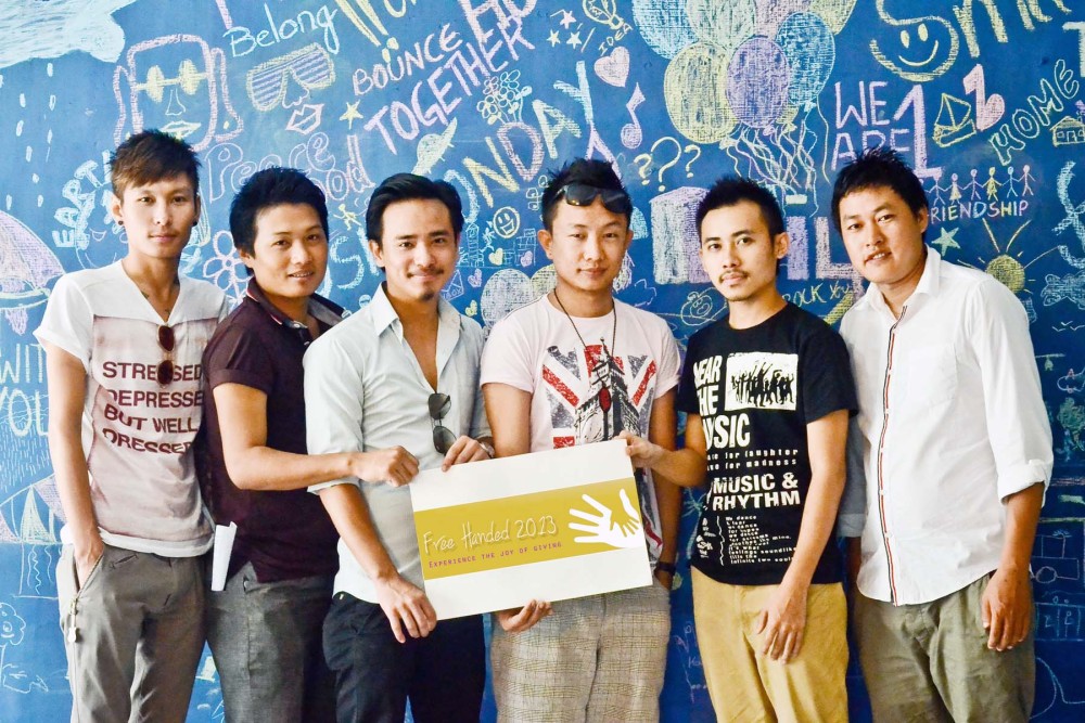 Alobo Naga & The Band pose with the brand logo of “Free-Handed Concert 2013”, with Clement Imsong, MD of Rockstar Entertainment International (second from left) and Talimoa, Chaplain of Youth Oasis Centre (first from right) during a press call held on May 23 at Hiyo Café, Dimapur. (Photo: Betoka Swu)