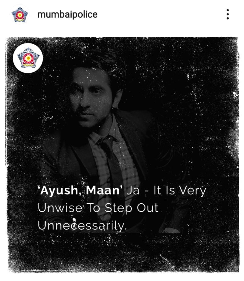 Mumbai Police borrowed from a popular dialogue of Kajol from "Kuch Kuch Hota Hai" to write alongside the meme: "Cheater, cheater, cheater... That's what you are!" The meme featuring Ayushmann Khurrana warns people against stepping out. It reads: 'Ayush, Maan' Ja -- it is very unwise to step out unnecessarily.