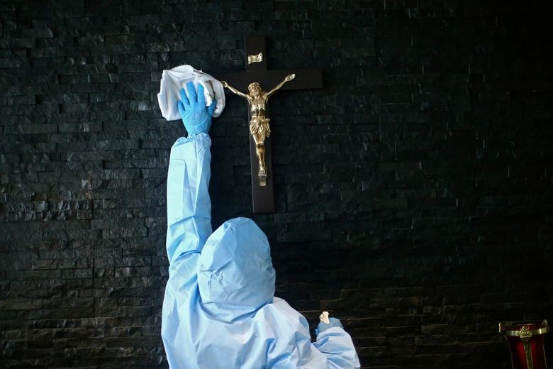 21st May 2020 An employee wearing protective clothing disinfects a crucifix at Funeral Gayosso in Mexico City. REUTERS/Edgard Garrido