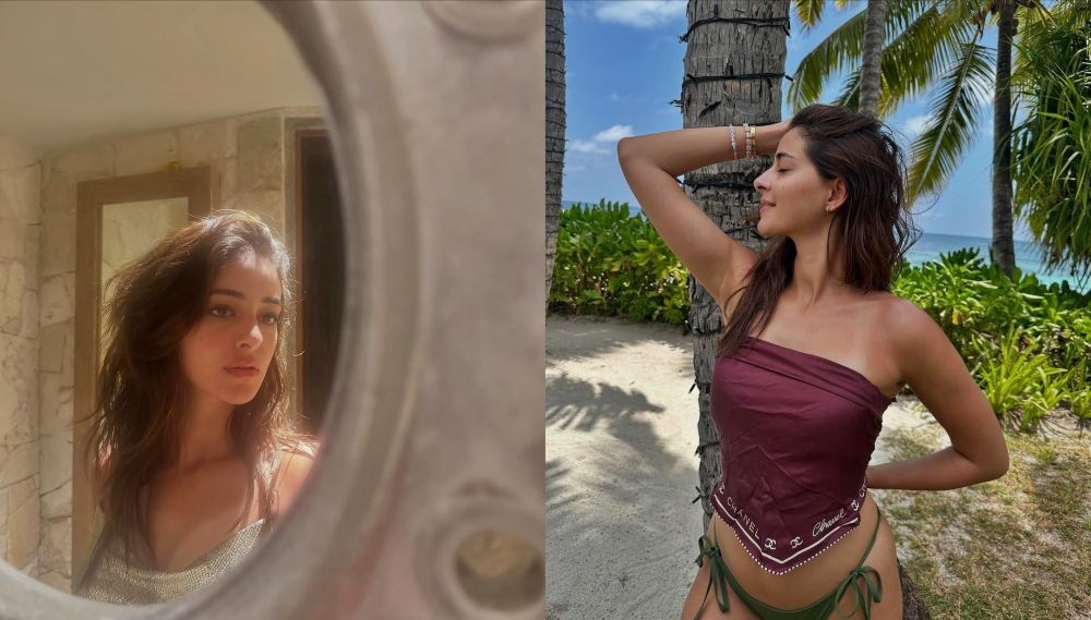 Ananya took to Instagram to share a series of images from her relaxing and luxurious getaway. In the first image, she flaunted her tan lines while posing in a bandana top paired with bikini bottoms. She then shared a stunning poolside shot captured during the golden hour. Another image showcased a close-up of her thigh-high slit skirt paired with a Chanel belt. She also posted a mirror selfie from the bathroom. The final picture featured her parents, Chunky Panday and Bhavana Panday.