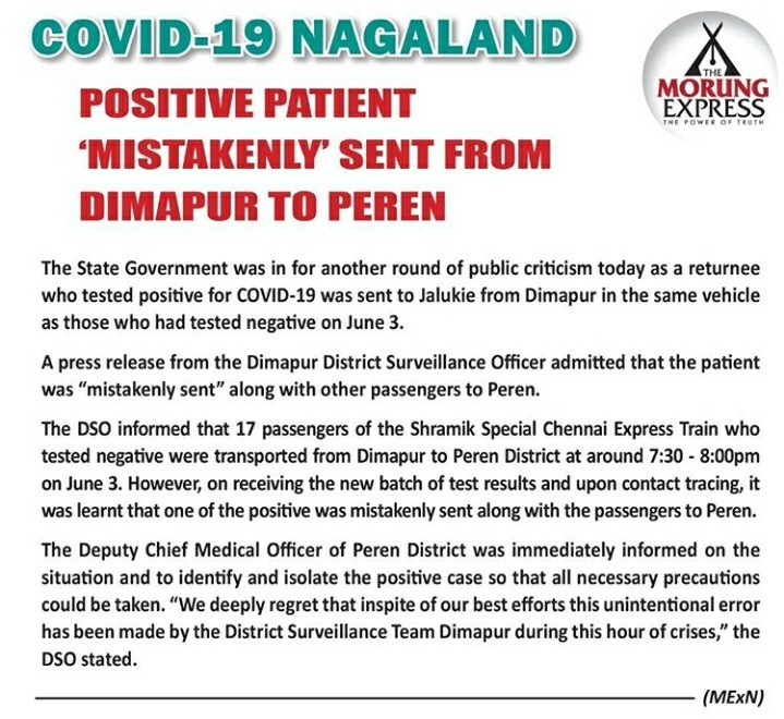 DIMAPUR, JUNE 4 (MExN): The State Government was in for another round of public criticism today as a returnee who tested positive for COVID-19 was sent to Jalukie from Dimapur in the same vehicle as those who had tested negative on June 3.