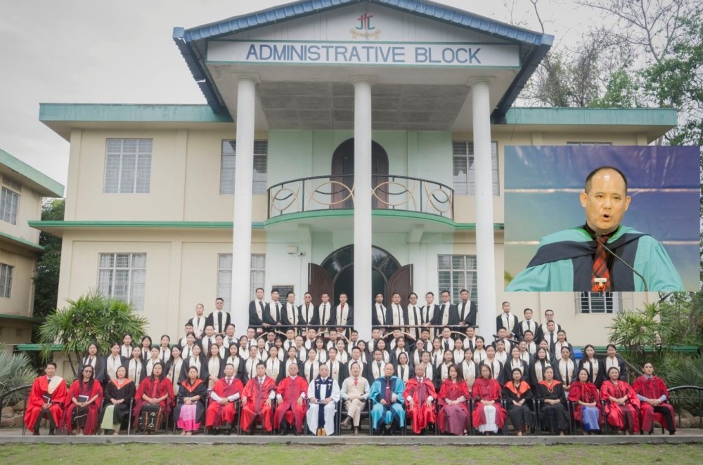 Graduating students, faculty and others during the29th Graduation Service of the Trinity Theological College Thahekhu, Dimapur on April 27. (Inset) NBCC General Secretary delivers the keynote address on the theme ‘Theological Knowledge: Not for Display but for Transformation.’ (Photo Courtesy: TTC)