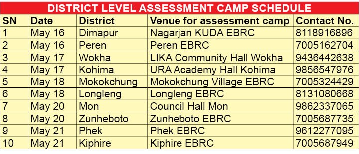 Kohima, May 14 (MExN): Assessment camps for children with special needs in the age group of 6 to 18 years will be held from May 16 to 22 in ten districts. The programme is being organised by Sarva Shiksha Abhiyan/Samagra Shiksha, Nagaland Education Mission Society in collaboration with Department of Health and Family Welfare, Star Key New Delhi and Nagaland Research Rehabilitation Centre (NRRC) Dimapur, Department of Social Welfare.