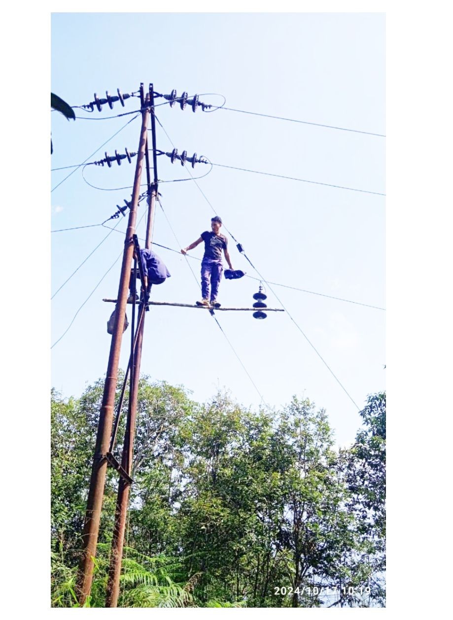 ‘Balancing Power’: In this photo shared by State DIPR, Electrical department staff from the Tening division, Peren, is seen replacing a punctured disc on the 33 kV line between Nkialwa and Mbaulwa on October 17. Balancing high in the air without any safety apparatus, they are steadying the grid. (DIPR Photo/X)