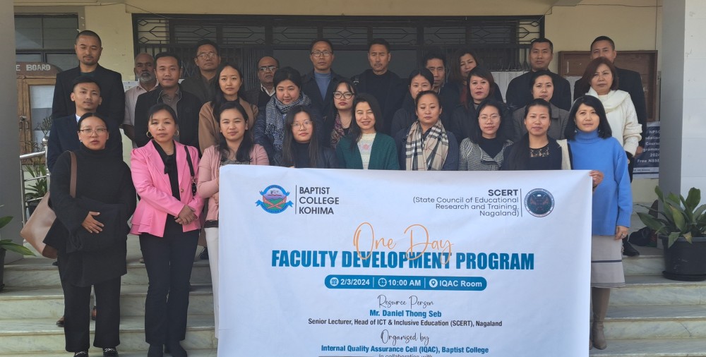 Kohima, March 2 (MExN): A Faculty Development Programme (FDP) on “Effective Teaching Strategies” was organised today at Baptist College Kohima. The programme was organised by Internal Quality Assurance Cell (lQAC) of the college in collaboration with State Council of Educational Research and Training (SCERT).