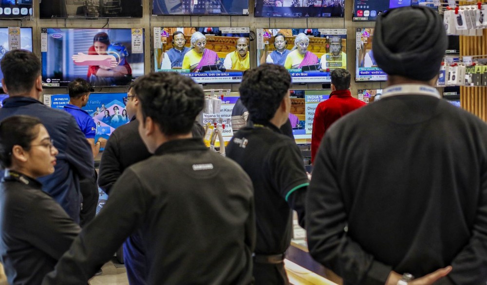 New Delhi: People watch the live presentation of the Union Budget 2026-27 on a television screen at an electronics showroom in New Delhi on Sunday, February 1, 2026. (Photo: IANS)