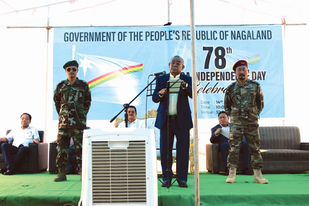 GPRN/NSCN Ato Kilonser N Kitovi Zhimomi addresses the 78th Naga Independence Day celebration at 5th Mile Chümoukedima on August 14.