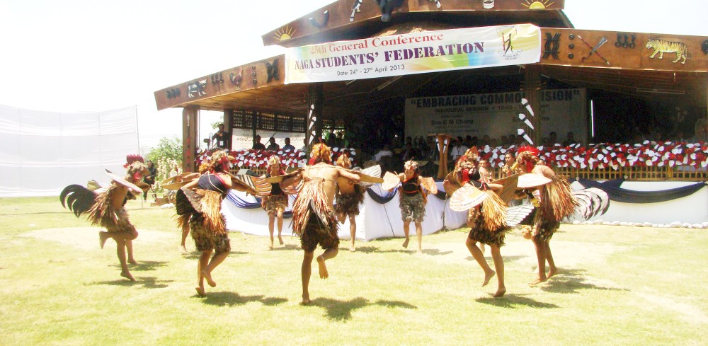 Members of the Chakesang Students Union performing a ‘Chicken Dance’ at the inaugural session of the NS 25th General Conference held at the Agri Expo, Dimapur.