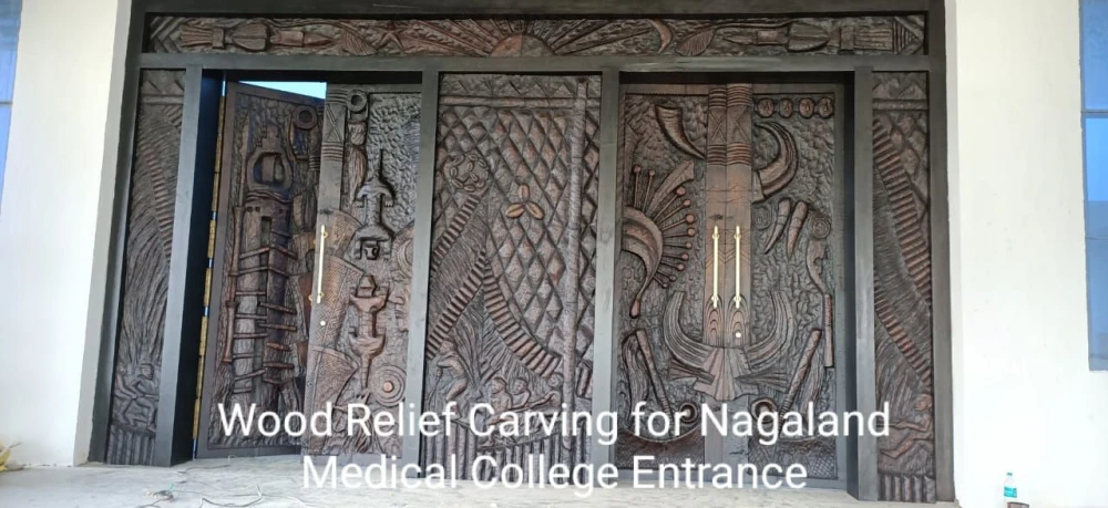 Since his self-taught beginnings, Wapang’s works have spread across Nagaland: monoliths, memorial busts, and public sculptures in stone and wood. His hands, calloused from both materials, carry the memory of each piece. He carved the grand entrance of Nagaland’s first medical college in Kohima, a project that kept him in the capital for nearly a year—and is now carving the main wooden door of P. Shilu Park in Mokokchung. “When you make something people will walk through every day,” he says, “it should speak to them—it must feel alive.”
