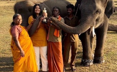 Mumbai, April 10 (IANS) 'The Elephant Whisperers' director Kartiki Gonsalves posted a picture of the entire cast of the documentary including the elephants Bommi and Raghu posing with the Oscar award.