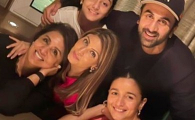 Mumbai, June 28 (IANS) Neetu Kapoor on Monday shared a glimpse of what she terms "my world" through an Instagram picture. The photo features Alia Bhatt with her son Ranbir Kapoor, daughter Riddhima Ka