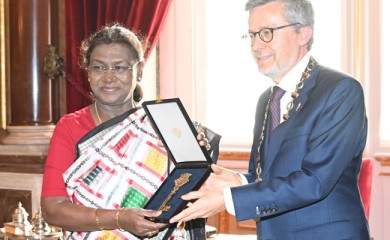 New Delhi, April 8 (IANS): President Droupadi Murmu received the ‘City Key of Honour’ of Lisbon City, from the Mayor at a function held at the City Hall of Lisbon (Portugal), last evening.President Murmu, s