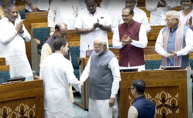 New Delhi, June 26 (IANS) Congress leader Rahul Gandhi shook hands with Prime Minister Narendra Modi as they came together to welcome the newly-elected Speaker of the 18th Lok Sabha, Om Birla, on Wednesday.This