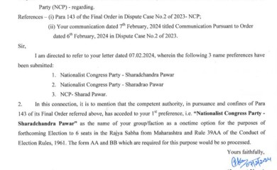 Mumbai/New Delhi, February 7 (IANS): The Election Commission on Wednesday allotted veteran leader Sharad Pawar’s faction the new one-time name of "Nationalist Congress Party-Sharadchandra Pawar", an official