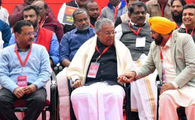 New Delhi, February 8 (IANS): Punjab Chief Minister Bhagwant Mann on Thursday joined the demonstration by his Kerala counterpart Pinarayi Vijayan against the Centre with his party chief and Delhi counterpart Ar