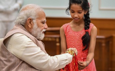 New Delhi, August 11 (PTI) Prime Minister Narendra Modi celebrated Raksha Bandhan on Thursday with the daughters of staff members working at his office tying rakhis on his wrist. He gave them a tricolour each f