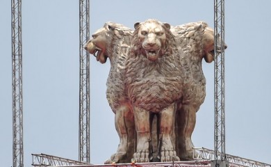 New Delhi, July 11 (PTI) Prime Minister Narendra Modi on Monday unveiled the national emblem cast on the roof of the new Parliament building here.