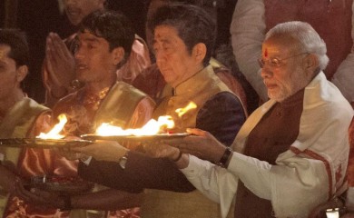 New Delhi, July 8 (PTI) With a 'tilak' on his forehead and a 'puja thali' in his hands, Shinzo Abe's picture attending the 'Ganga Aarti' alongside Prime Minister Narendra Modi at the