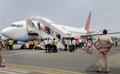 Patna, June 19 (PTI) Nearly 200 people on board a Delhi-bound aircraft on Sunday had a close shave as the plane caught fire soon after take-off from the airport here and made an emergency landing minutes later,