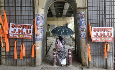 New Delhi, April 15 (PTI) The Hindu Sena has put up posters and saffron flags near the main gate of the Jawaharlal Nehru University and surrounding areas almost a week after a clash broke out in a hostel over a