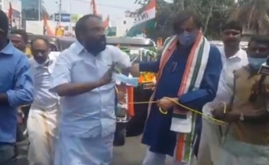 Thiruvananthapuram, February 26 (IANS): Congress leader Shashi Tharoor on Friday protested against the rising fuel prices by pulling an auto rickshaw with a rope here.
