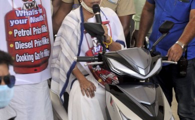 Kolkata, February 25 (PTI): In a unique protest against fuel price hike, West Bengal Chief Minister Mamata Banerjee on Thursday rode pillion on an electric scooter to state secretariat Nabanna.